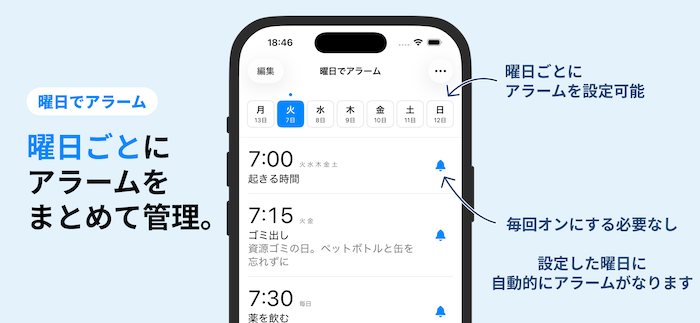 そんな日々の細かな要望を叶えるのが「曜日でアラーム」です。